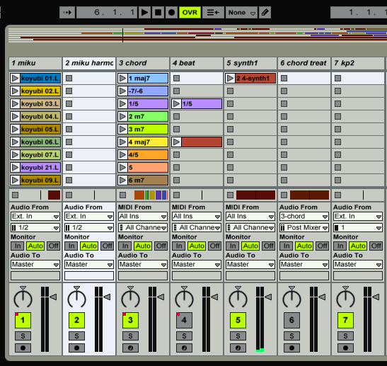 で。先日アップした「小指」はどうやって作ったのか。と聞かれたので、というより聞かれたことが嬉しかったので大いにバラしたいと思います。 ホワイトノイズに近いリズムの音色は、持ってるソフトサンプラー(KONTAKT2)で以前に遊び半分で作ったものです。フィールド・レコーディングというのもおこがましいてっきとーな元サンプルがこれ。旅行先の食堂で定食食べながら録ってます。 さしたるビジョンも持たずにサンプラーに放りこみ、リズム音ぐらいにしか使い道が思いつかなかったので、ローファイ系のエフェクトをかけて、LFOでパラメーターを動かして。こんなんなりました。 付与してるノイズの音しかしてないので、元サンプルとかどうでも良かったのでは、とかは考えない。プロセスが重要です。 (1)別の曲で使ったピアノの音に (2)フィルターをいろいろいじくってたら何故か短音として扱えそうになったので (3)サンプラーに取り込み、そこでもフィルターをかけて。で、カットオフの周波数とレゾナンスにそれぞれLFOをかけると、音程+チリチリ音が。チリチリ感がループしないよう、カットオフの方にはLFOを2機かけております(左画像)。 (1)から(3)はこんな感じで変遷。 あとはオマケのような音色が2つ。イントロに出てくるシンセ音がReaktorについてきたGaugearという変なシンセで、壊れ気味のスライドギターは、自分で弾いたものをカオスパッドに取り込み、演奏しなおしています。 ミックスでは二手間ぐらい。歌を3トラックに分割してそれぞれのパンとEQのオートメーションを個別に書いたのとが一手間。チリチリしてる方のシンセを、少しパラメーター変えたのを二通り書き出して左右に。で、それぞれに100msぐらいのディレイを掛けて、左右逆にして振ってます。これが二手間。 しかし何という機材ありきの作り方でありましょう。でもエレクトロニカはそういう色の濃い音楽だからいいのだ。「ここはファだよね」という判断と、「ここはこういうざりざりした音だよね」「でディレイかけてここに置くよね」という判断を等価にした(あるいは主従を逆転させた)ものだと思ってます、エレクトロニカって。 記し忘れてましたがこんな適当なもの作りました。 立浪に1号が出てほっとしたよ! PR 2008.06.22 Sun 01:18:31 「小指」という曲を作ってニコニコ動画にアップロードしました。VOCALOIDを使ったおれ的エレクトロニカ。70%から先が上手くいかない歌ものからの逃避として作成。アカウントを持ってる方は下記リンクより、アカウントはないけどマイミクの人はmixiで観て下さいまし。そのどちらでもない人は…これから考える。